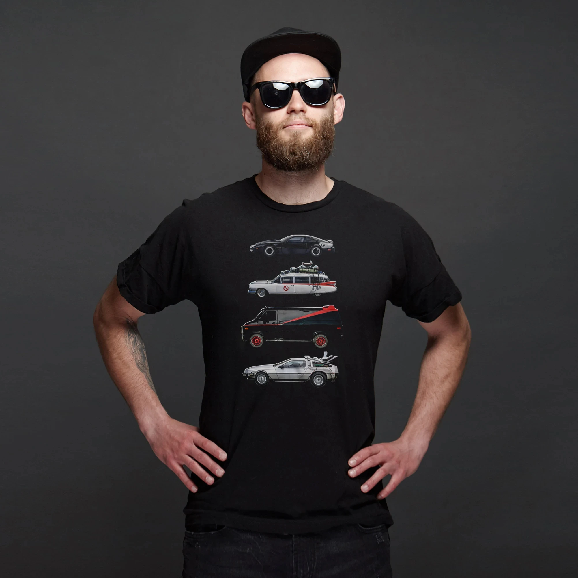 Męska koszulka z grafiką retro samochodów filmowych, vintage nadruk pojazdów z lat 80., codzienna koszulka z krótkim rękawem, streetwear, zabawny prezent.