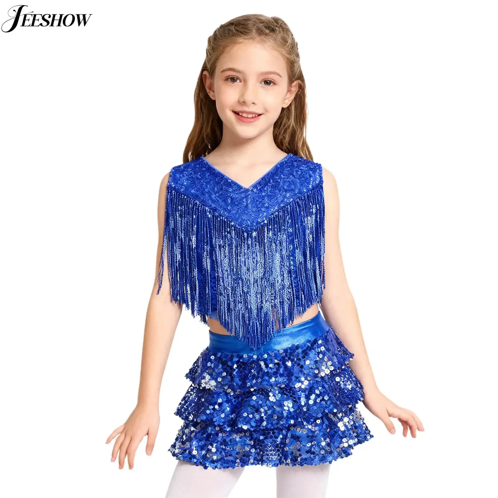 Stroje dla dziewczynek w stylu lat 70., kostiumy disco, stroje do tańca jazzowego, błyszczące cekinowe bezrękawniki z frędzlami i warstwowe spódnice z falbanami.