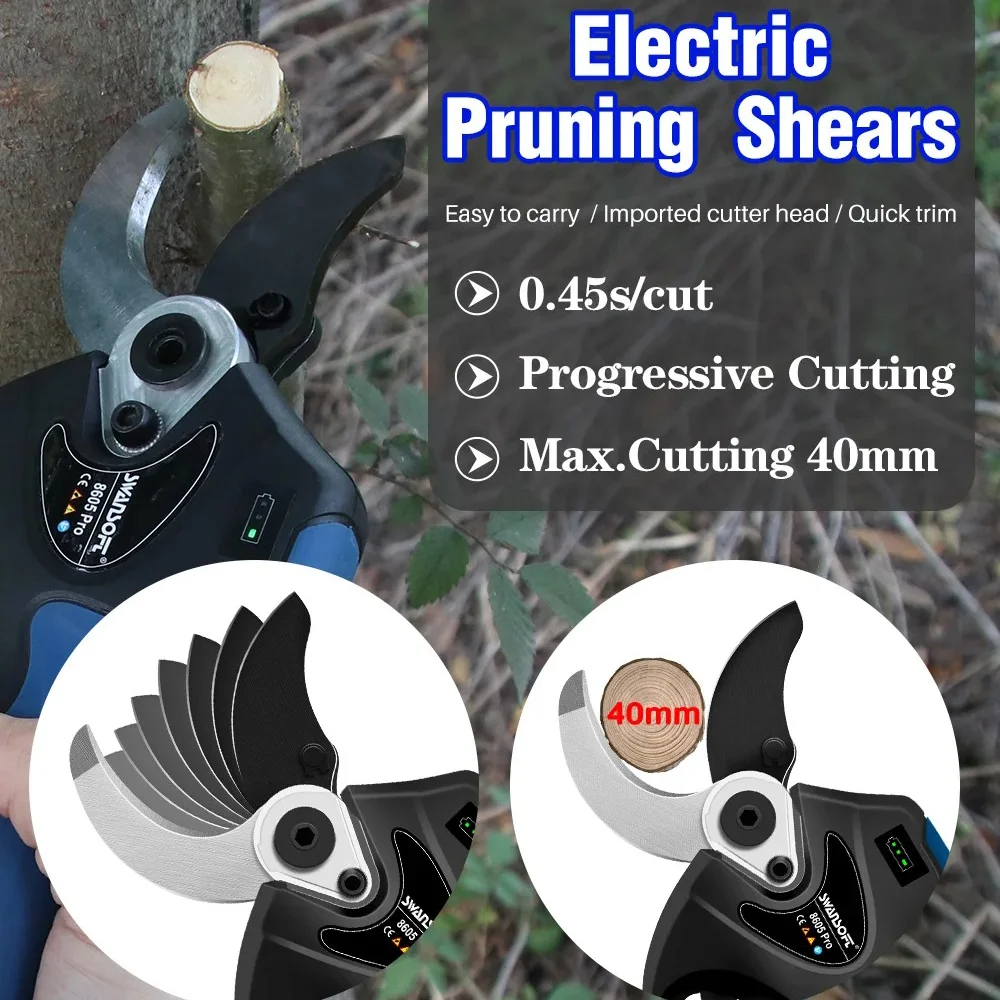 Elektryczne nożyce do przycinania SWANSOFT 40mm z dwoma akumulatorami, ostrzami i torbą na pas, z funkcją progresywnego cięcia do ogrodów i sadów, model 8605PRO