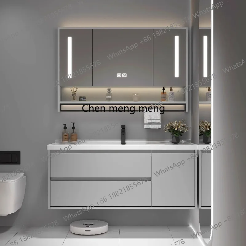 Nowoczesne, niestandardowe szafki łazienkowe wiszące na ścianie z wodoodpornym umywalką z litego drewna, szafką z lustrem i lustrem łazienkowym z oświetleniem LED.