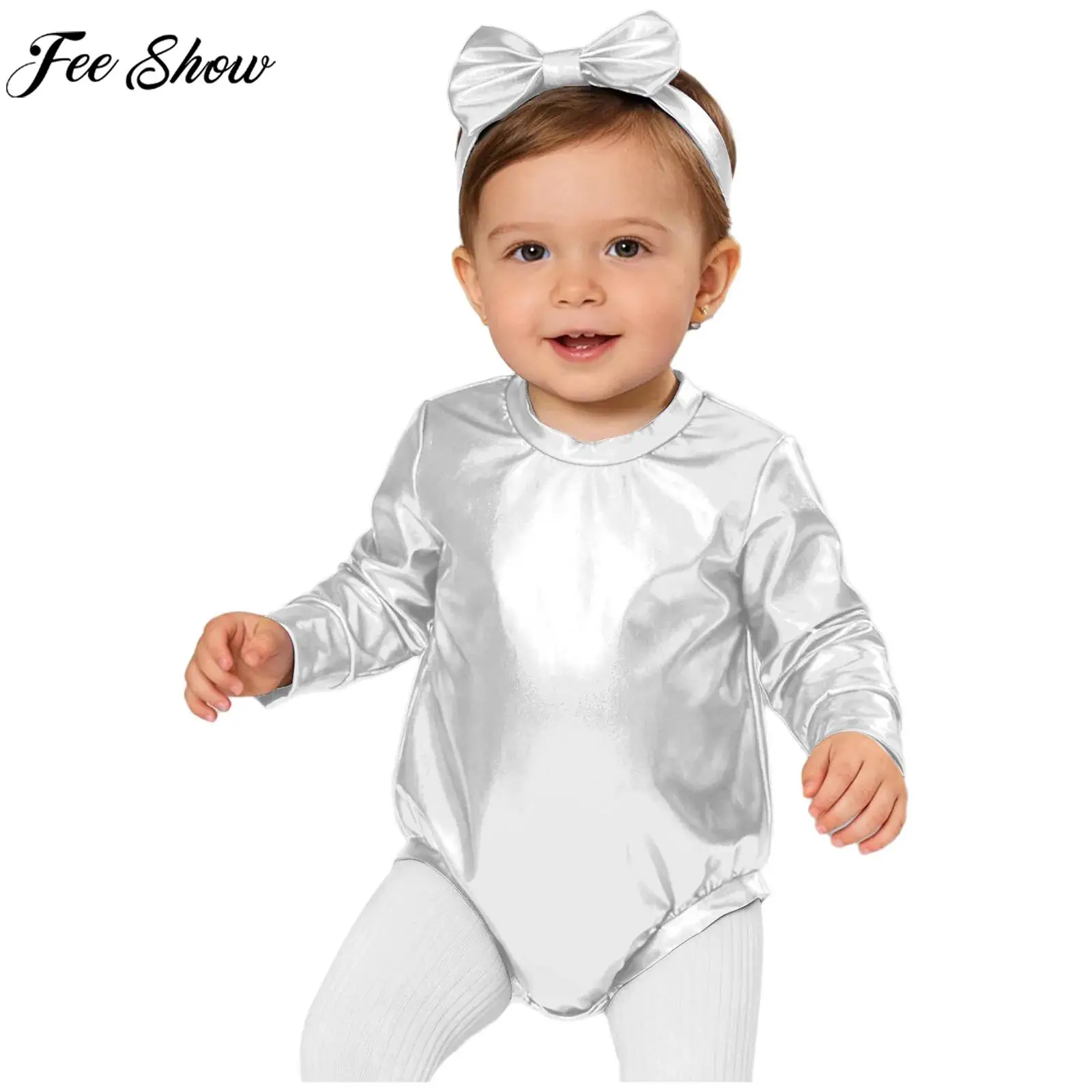 Metaliczny, błyszczący strój dla niemowląt, body z długim rękawem, zapinane na guziki, z kokardką na głowie, kostium na urodziny, imprezę tematyczną, sesję zdjęciową.