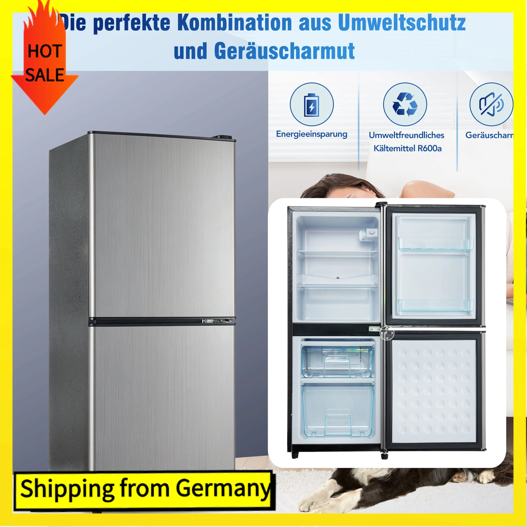 Lodówka Comanlai 106L z oświetleniem LED i 2 drzwiami, lodówka 60L + zamrażarka 46L, 7 poziomów regulacji temperatury, 42,5x44,5x102cm