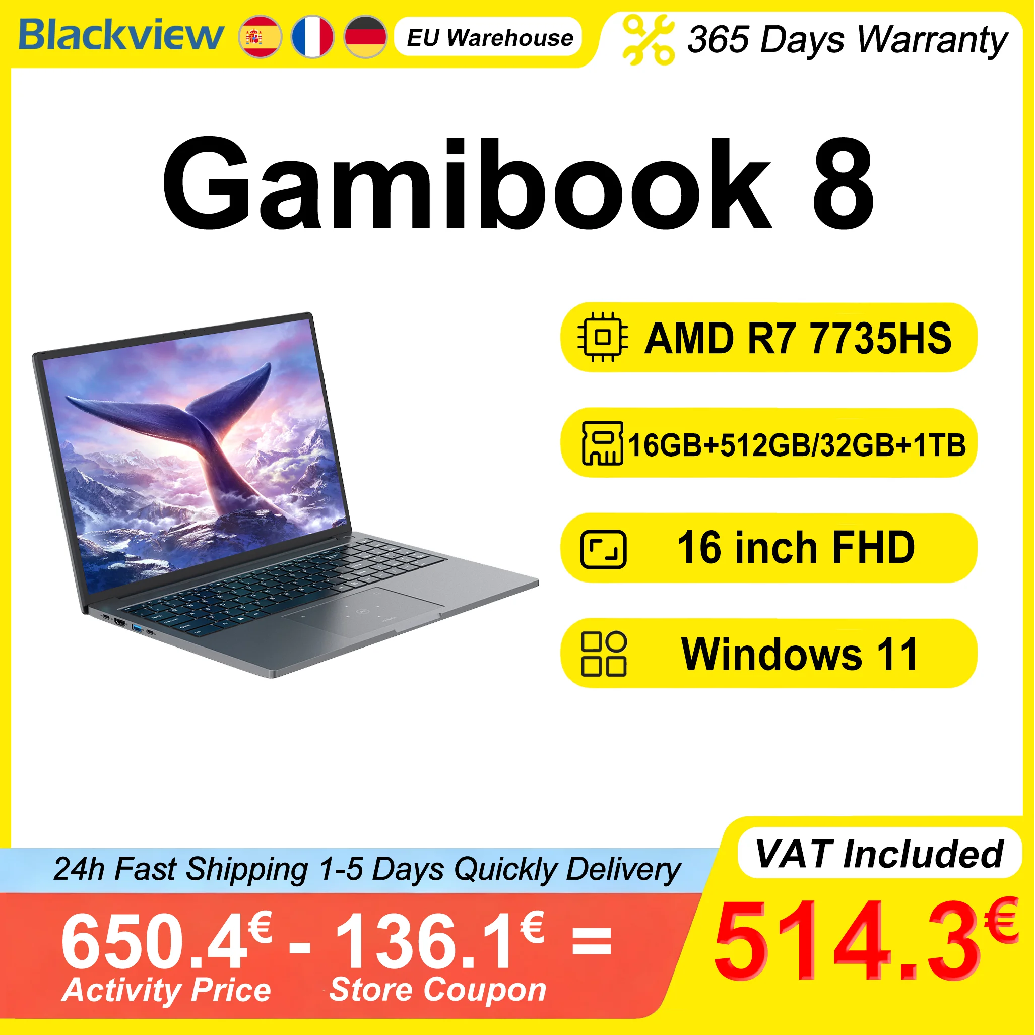 Blackview Laptop GamiBook 8 16 cali AMD R7 7735HS LPDDR5 16GB/32GB RAM 512GB/1TB ROM Windows 11 Pro BT5.2 Wifi 6 Podświetlana Klawiatura