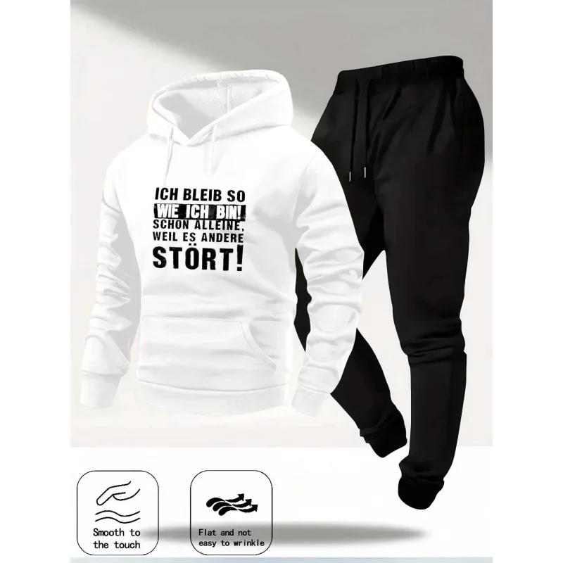 Zestaw: bluza z kapturem biało-czarna, spodnie dresowe z nadrukiem ICH BLEIB SO LANGE SCHON ALLEINE WEIL ES ANDERE STORT, odzież sportowa codzienna dla mężczyzn i kobiet