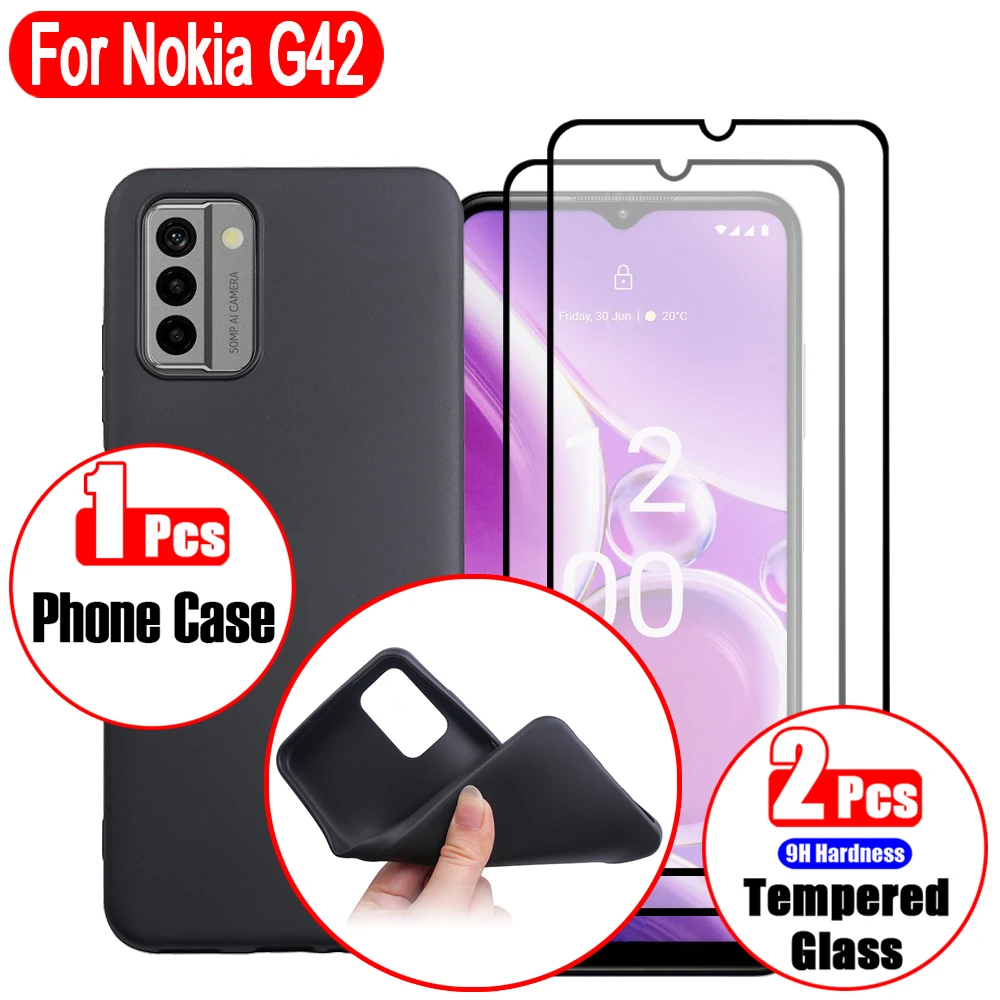 Etui do Nokia G42 (5G), zestaw 3 w 1 (1 szt. etui na telefon + 2 szt. folii ochronnych na ekran), czarny, z nadrukiem na krawędziach, odporny na odciski palców