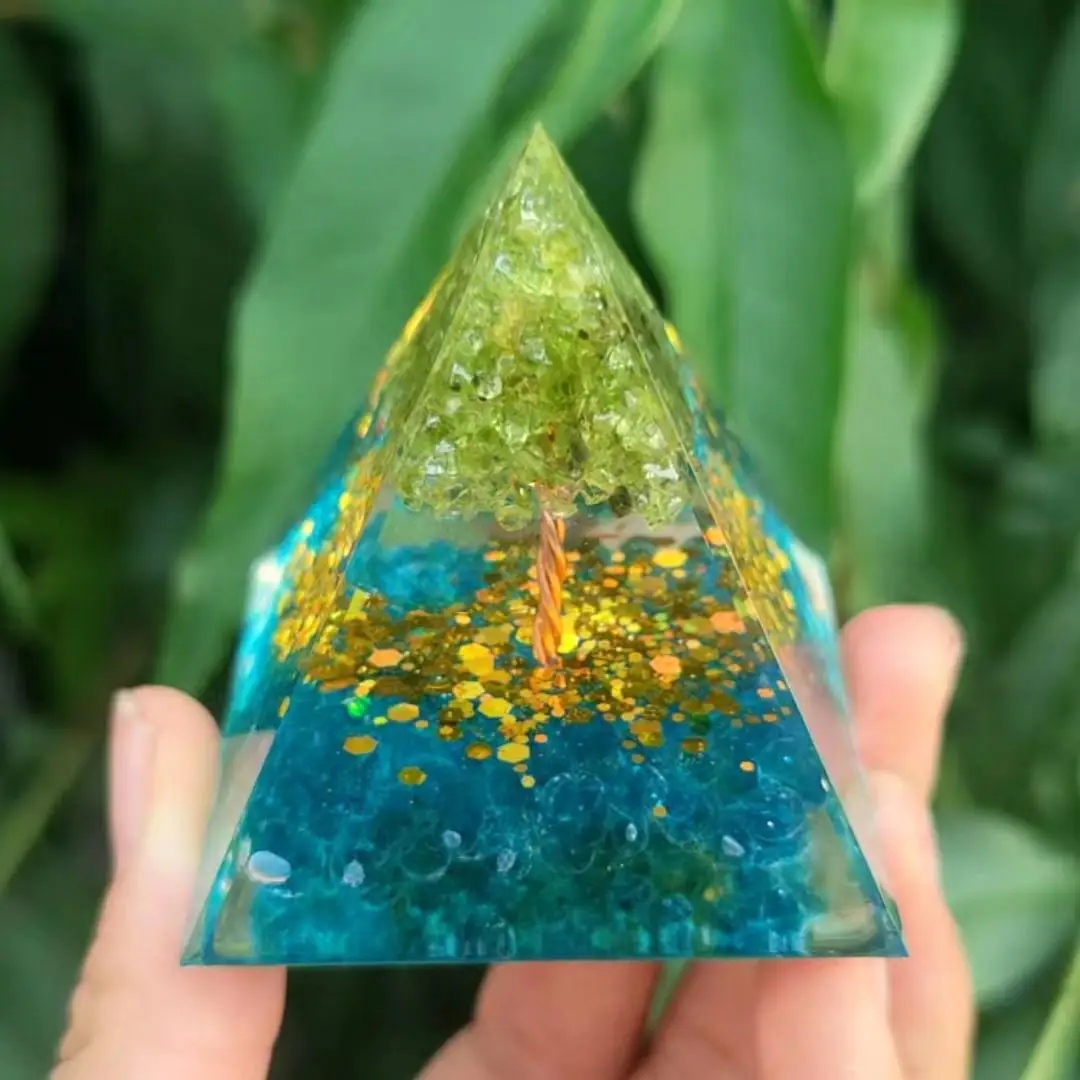 1 szt. Piramida Orgonowa Drzewo Życia z Peridotem i Akwamarynem, Kryształ Orgonitowy, Ozdoba Piramida z Żywicy z Akwamarynowym Żwirkiem, Piramida Kryształowa