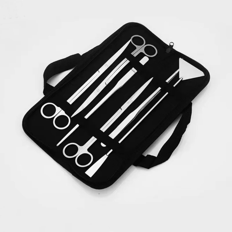 Zestaw narzędzi do akwarium: nożyczki faliste, pęsety, narzędzia do pielęgnacji roślin i trawy, nierdzewne narzędzia czyszczące, szufelki do akwarium, akcesoria akwariowe.