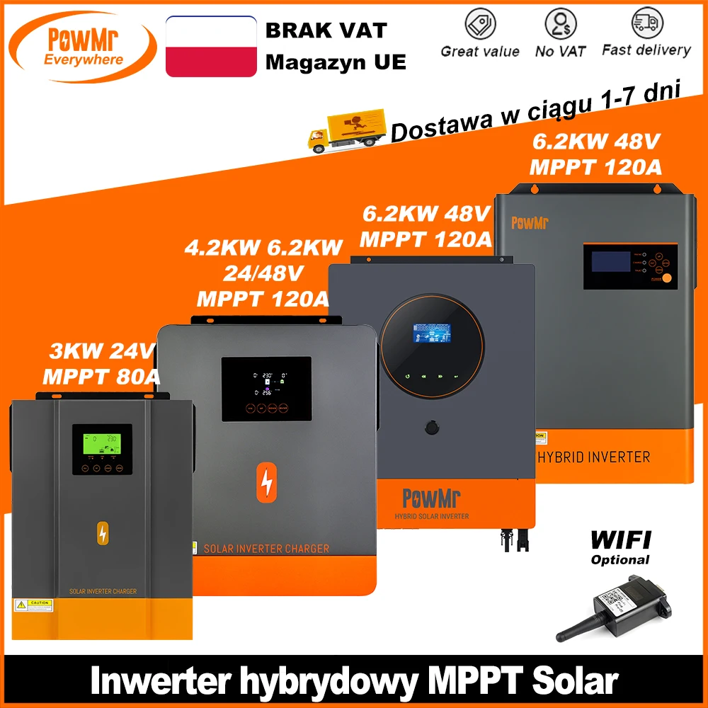 PowMr posiada hybrydowe falowniki fotowoltaiczne o mocy 3,2 kW, 24 V, falowniki słoneczne 230 VAC z wbudowanym kontrolerem ładowania słonecznego MPPT 80 A, zakres napięcia wejściowego 30-400 VDC.