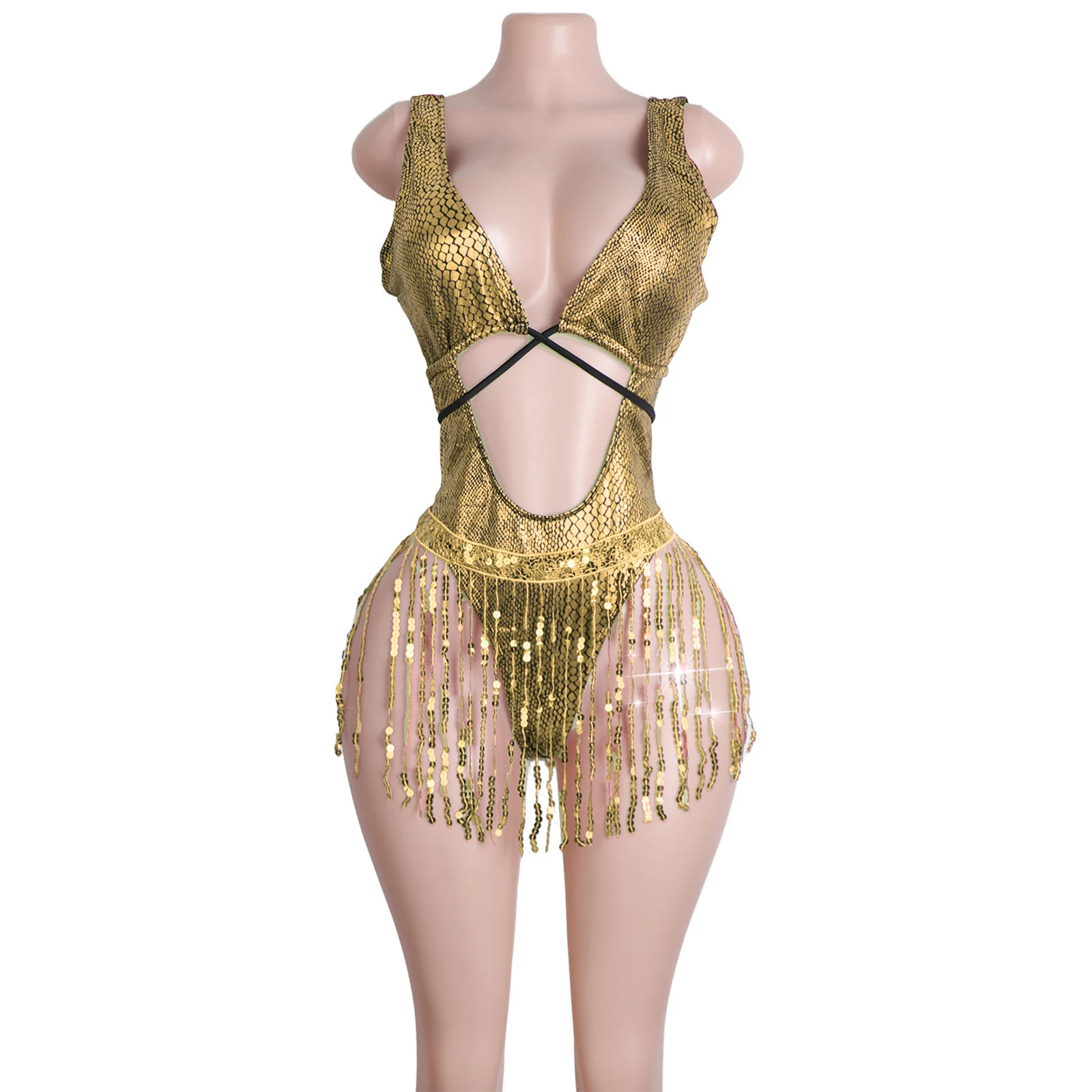Regulowane Ramiączka Frędzle Cekiny Wzór Węża Stringi Kombinezony Seksowna Odzież Klubowa Kostiumy do Tańca Egzotycznego dla Kobiet