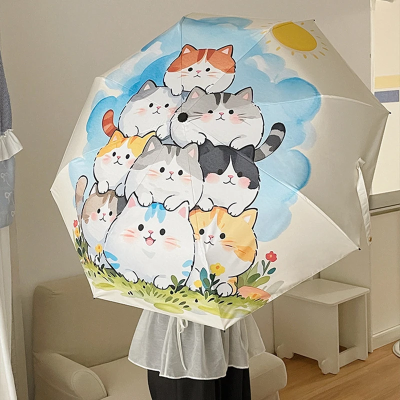 Guarda-chuva infantil com desenho de gato, guarda-chuva dobrável totalmente automático, guarda-chuva para crianças, guarda-chuva para sol e chuva, guarda-chuva portátil para mulheres
