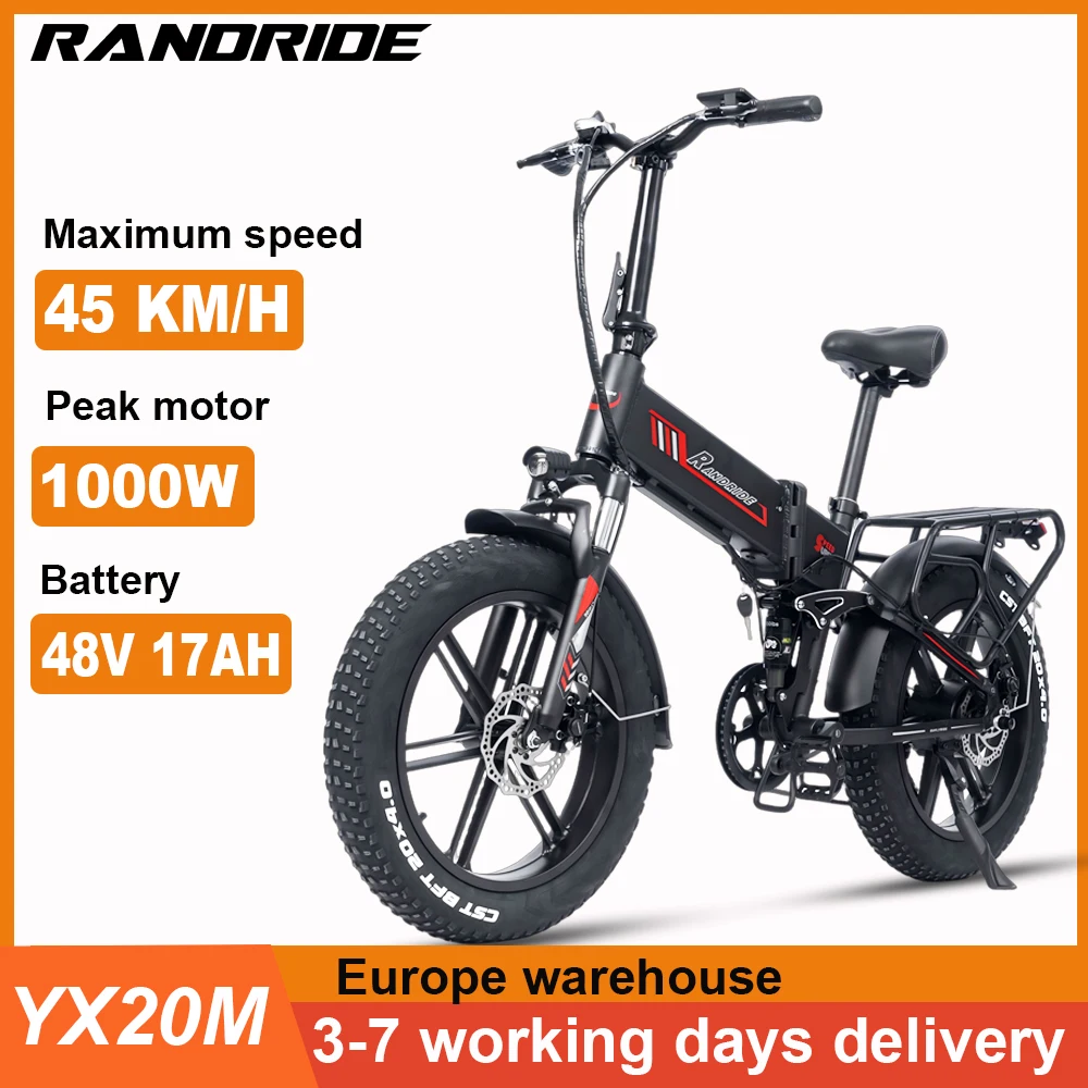 RANDRIDE YX20M Bicicleta Elétrica 1000W 48V 17Ah 20 Polegada Pneu Gordo Dobrável E-Bike com Freio a Disco Mecânico