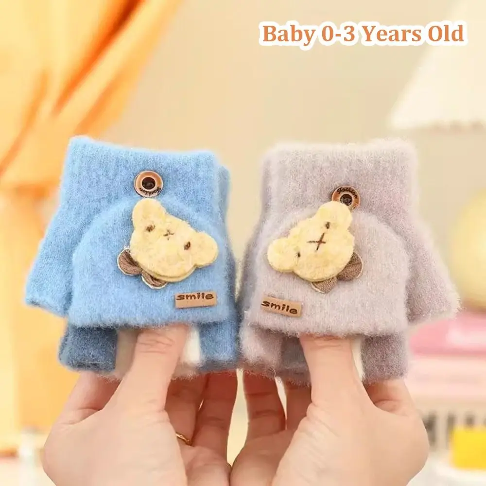 Luvas de malha fofas dos desenhos animados para crianças, peles artificiais, pescoço pendurado, luvas grossas quentes para bebês meninos e meninas, 1 a 4 anos, novo quente