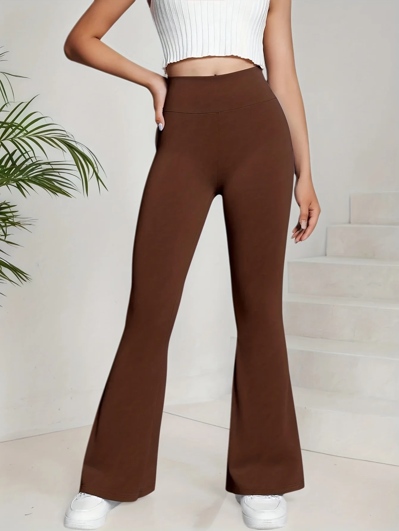 Calças Femininas de Cintura Alta com Efeito Levanta Bumbum, Marrom, Elásticas, Boca de Sino, Sem Costuras Incômodas, Calças Casuais de Yoga para Primavera