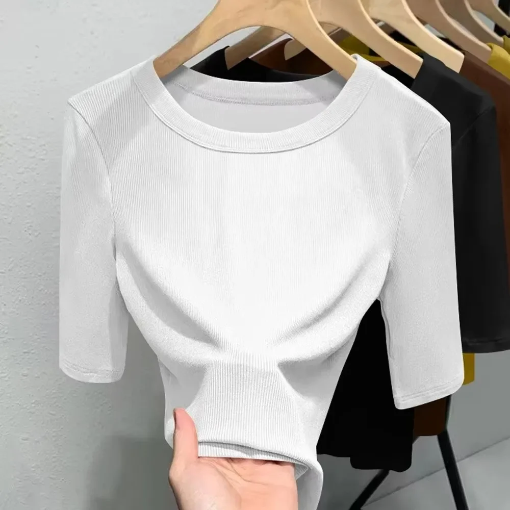 Nova cor sólida meia manga camiseta tripulação pescoço versátil em torno do pescoço superior magro manga curta camiseta primavera verão