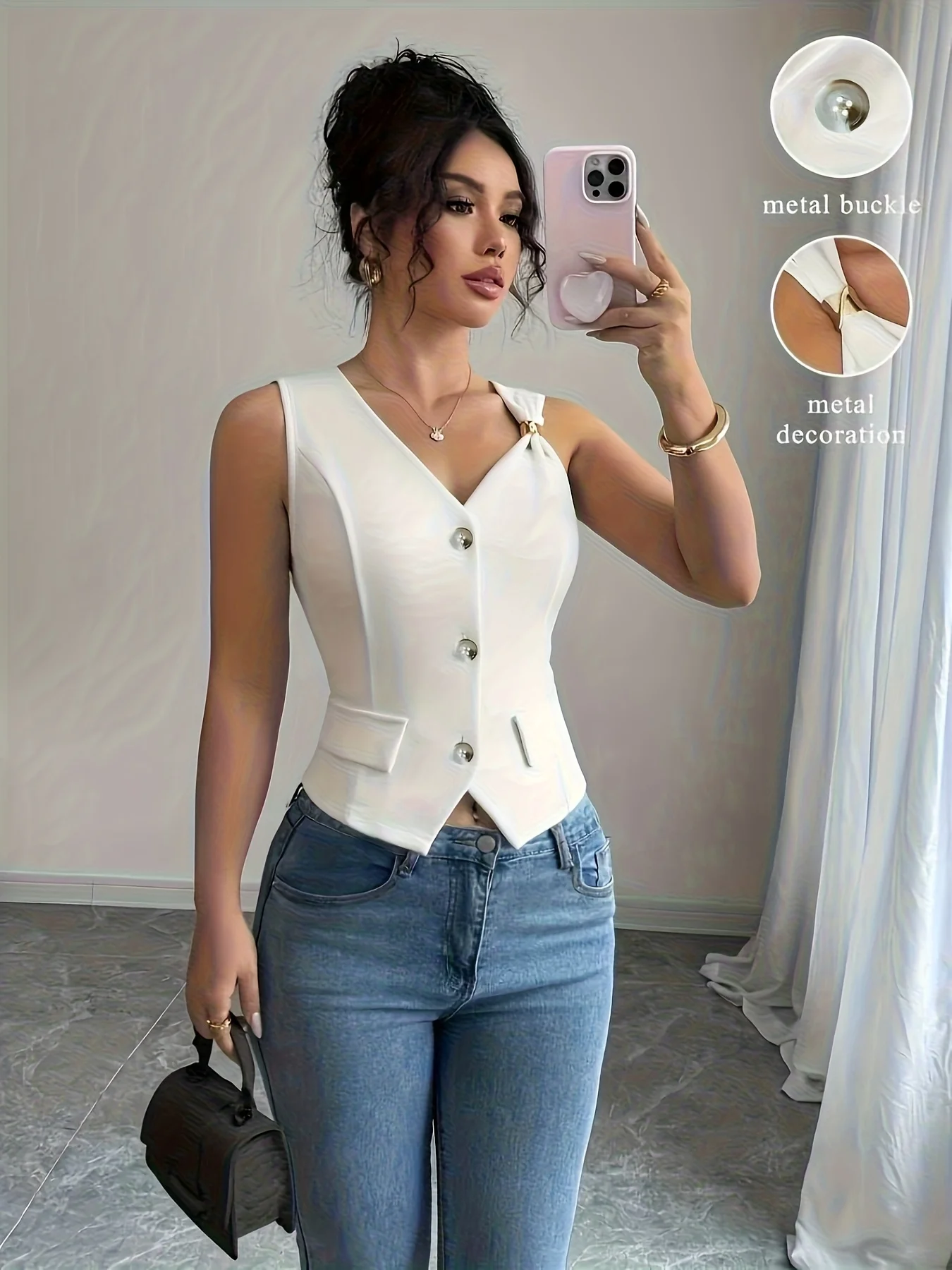 Colete Feminino Premium de Cor Sólida, Estilo Profissional para o Dia a Dia, Abertura Frontal com Bolsos Falsos