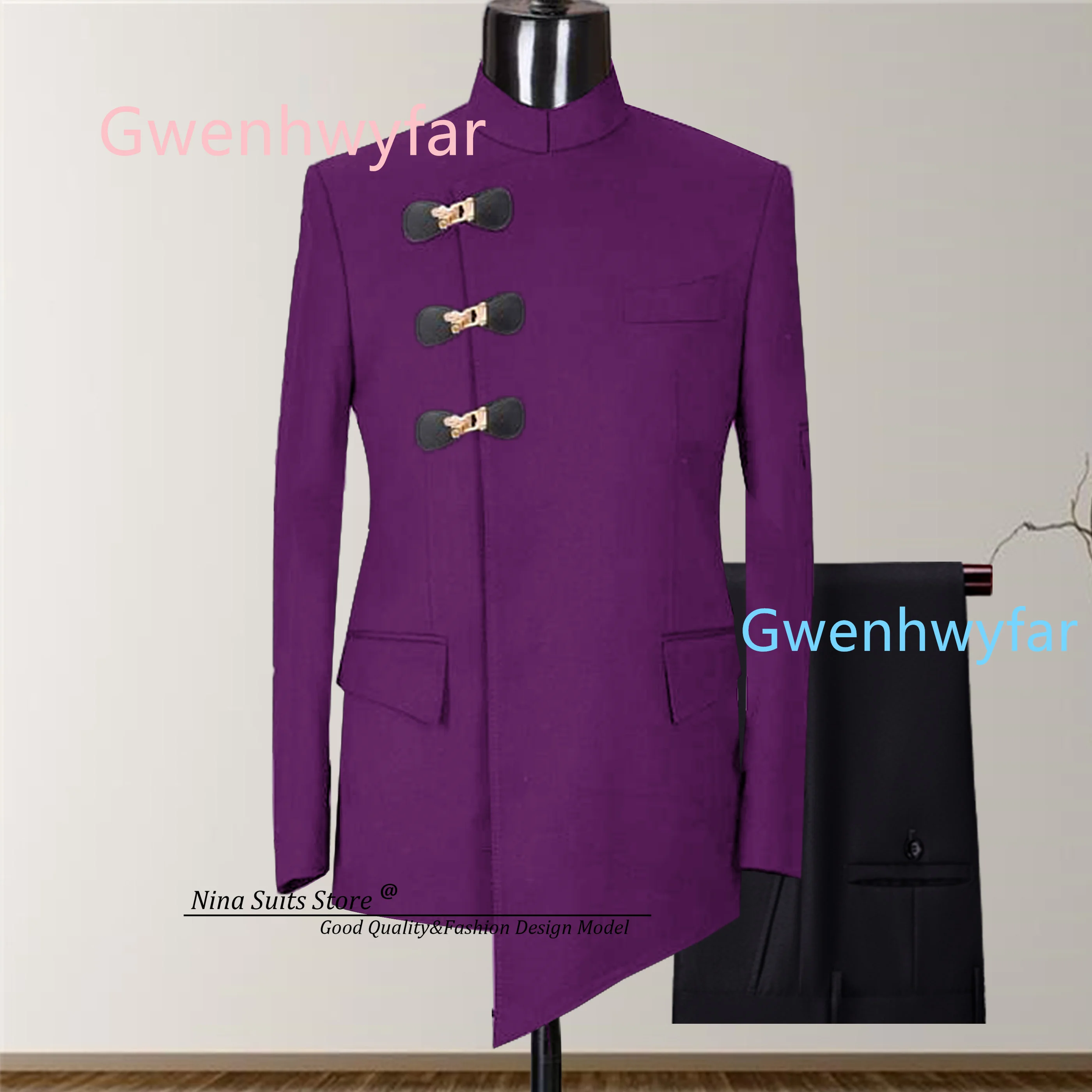 Gwenhwyfar 2026 Nova Coleção Primavera: Terno Masculino Estilo Africano com Blazer Roxo, Calça Preta e Detalhe Assimétrico na Bainha com Botões de Couro
