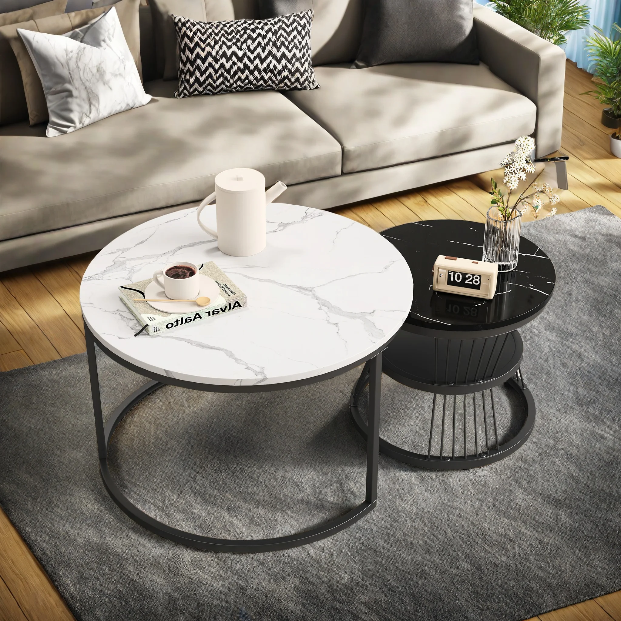Conjunto de café redondo moderno de mármore, 2 mesas de destaque empilháveis para sala de estar, móveis de pedra sinterizada, mesa final
