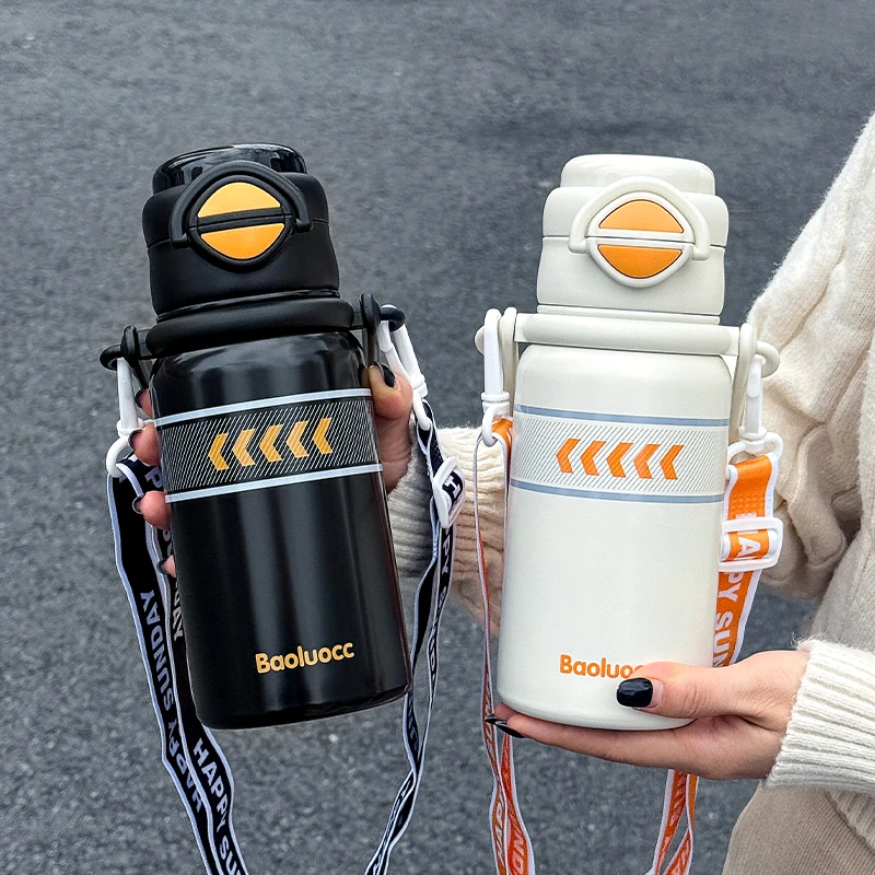 Copo Térmico de Aço Inoxidável Isolado a Vácuo, 600ml, Bico Duplo com Alça, Garrafa Esportiva com Alça de Ombro