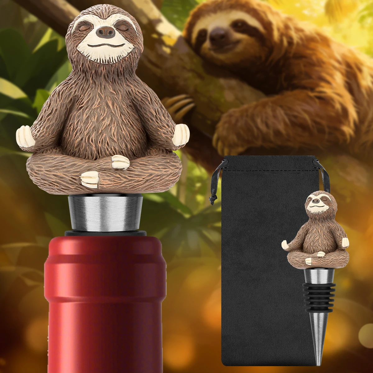 Rolha de Vinho em Resina com Formato de Preguiça, Rolha de Garrafa de Metal, Decoração Divertida de Preguiça, Ferramenta para Churrasco, Gadget de Bar com Bolsa, Presente de Dia dos Pais para Pai e Homens