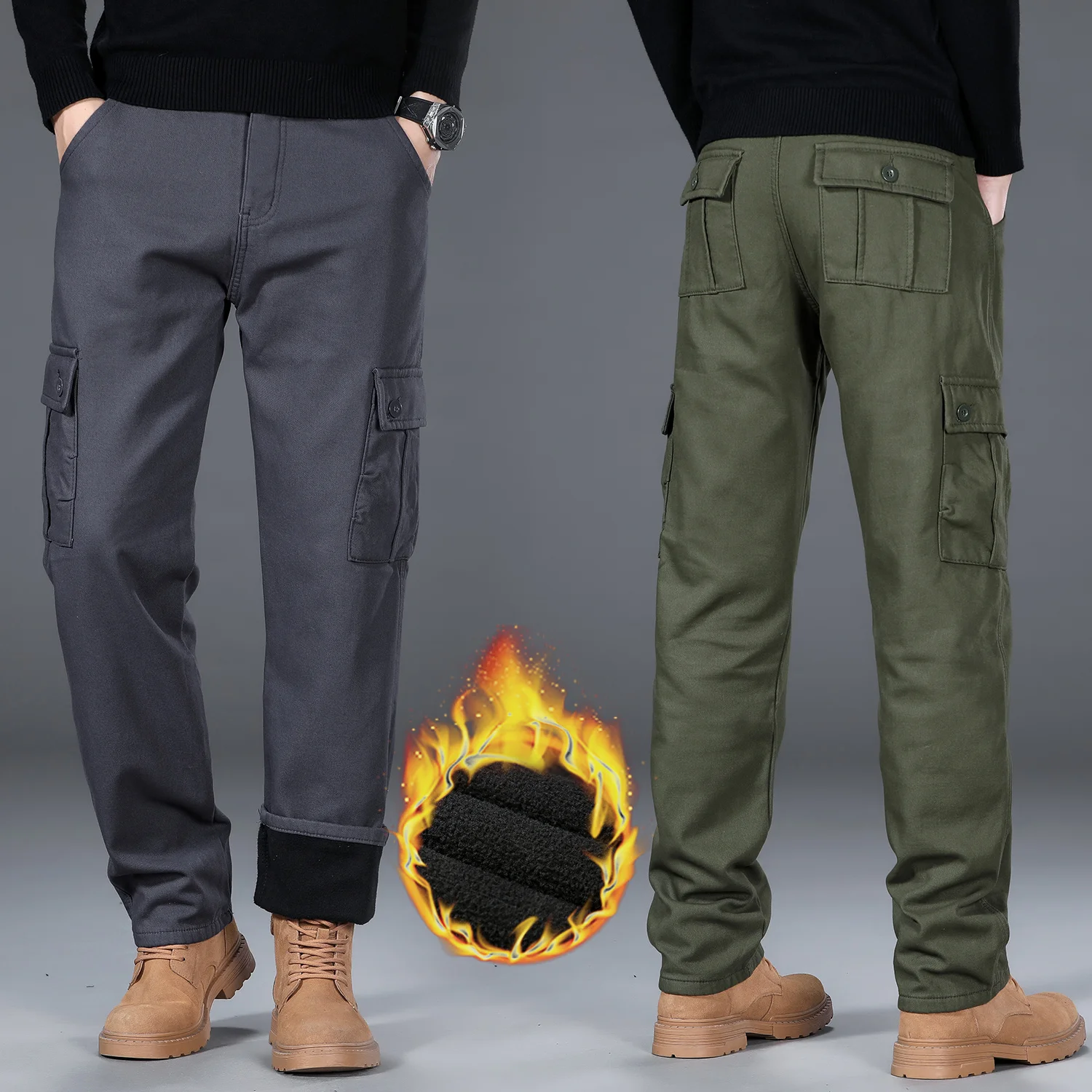 Calças de trabalho com vários bolsos masculinas europeias e americanas, novos estilos para outono e inverno, calças compridas com punho casual escovado.