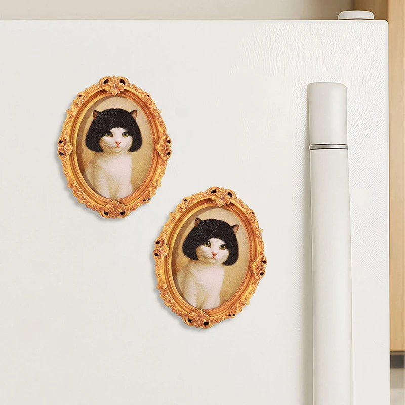 Mini Porta-Retrato Oval Retrô de Madeira com Ímã de Geladeira, Gato Engraçado e Corte de Cabelo, Decoração Moderna para Cozinha, Ornamento Durável para Geladeira