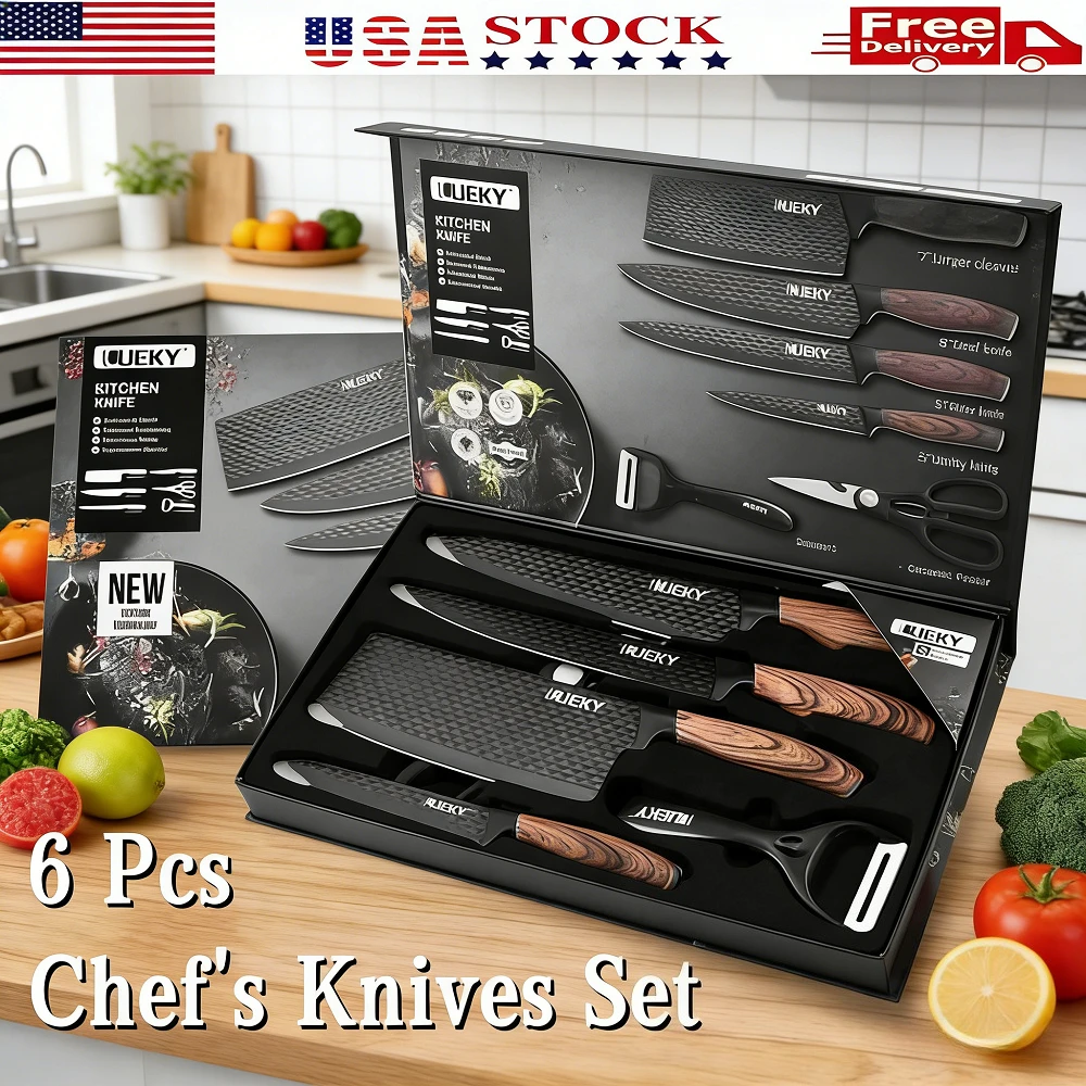 Conjunto de Facas de Cozinha DFITO 6 Peças em Aço Inoxidável de Alto Carbono com Cabo de Madeira, Facas de Chef Afiadas com Caixa de Presente para Casa e Restaurante