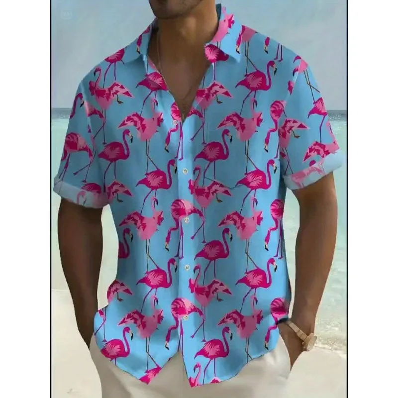 Camisa Masculina de Manga Curta Estilo Havaiano Listrada com Flamingo Impressão 3D Moda Tendência de Rua Praia Estilo de Férias