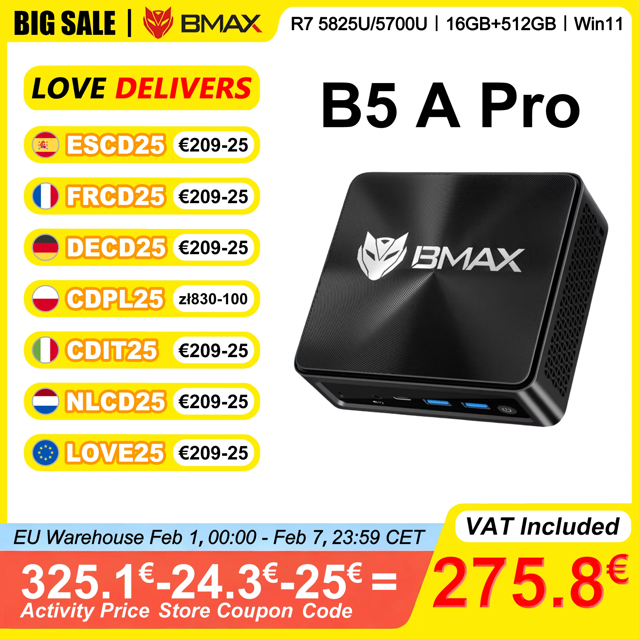 BMAX B5 A Pro Mini PC AMD Ryzen 7 5825U/5700U 16GB DDR4 RAM 512GB NVMe SSD HDMI Type-C Display 4K @ 60Hz Mini Computador Desktop