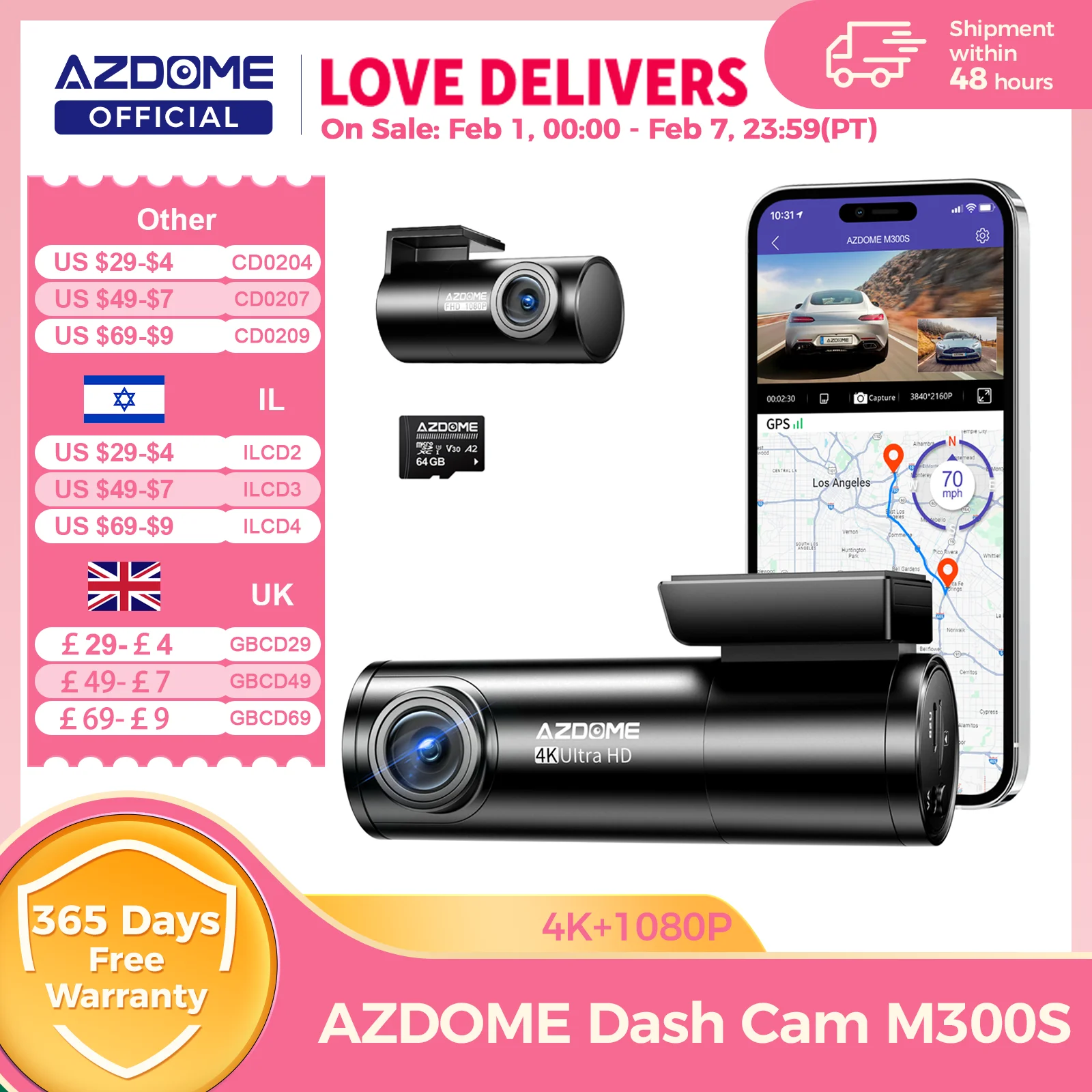 Câmera Veicular AZDOME M300S 4K+1080P com Câmera Traseira, Lente de 800MP, GPS Integrado, WIFI, DVR Automotivo, Controle por Voz e Visão Noturna