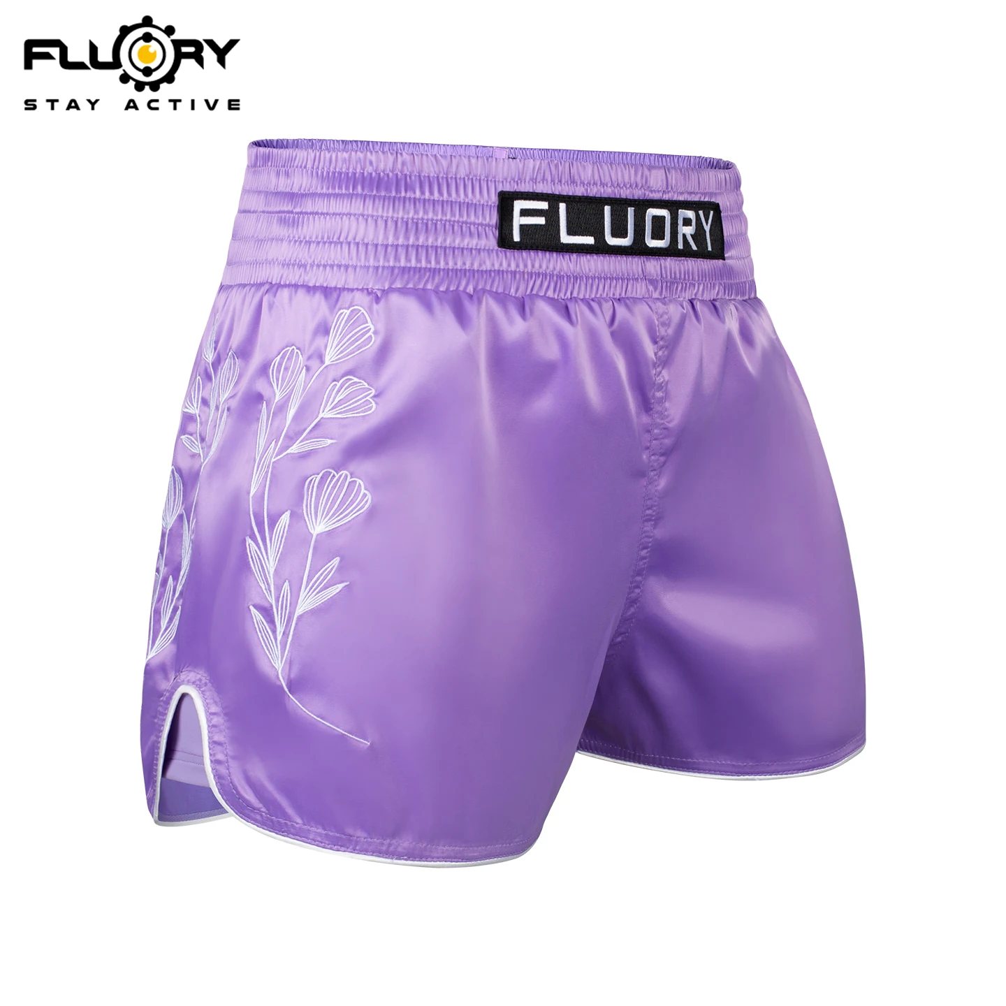 FLUORY Shorts Muay Thai bordados roxos com calças traseiras, calças de boxe com bolso antirreflexo, calças de ioga, shorts de treinamento de ginástica