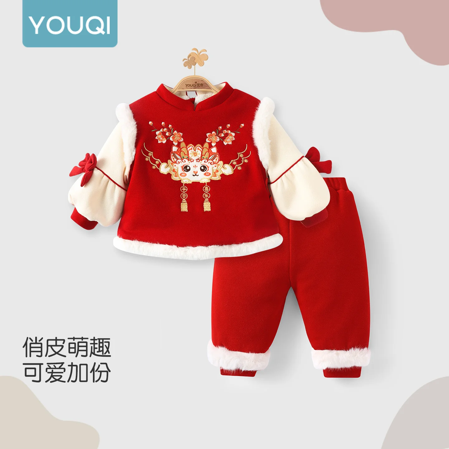 【Youqi】Roupas de bebê chinês para 0-2 anos, roupas de outono e inverno, vestido colete quente forrado de lã para meninas, vestido de princesa, vestido de primeiro aniversário, vestido de inverno