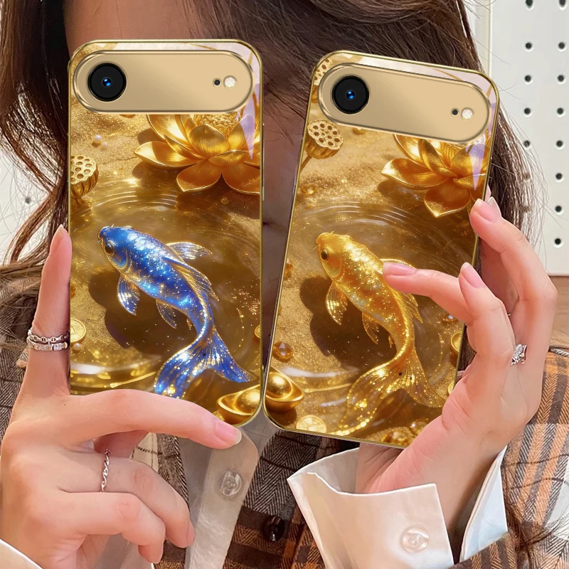 Capa de celular de vidro dourado com estampa de peixe koi rosa e pólen dourado para iPhone 17 Pro Max, 16, 17 Pro, 15 Pro, 14, 13 Plus, 12 Mini, 11 Pro Max, XR, 16E, 17 Air