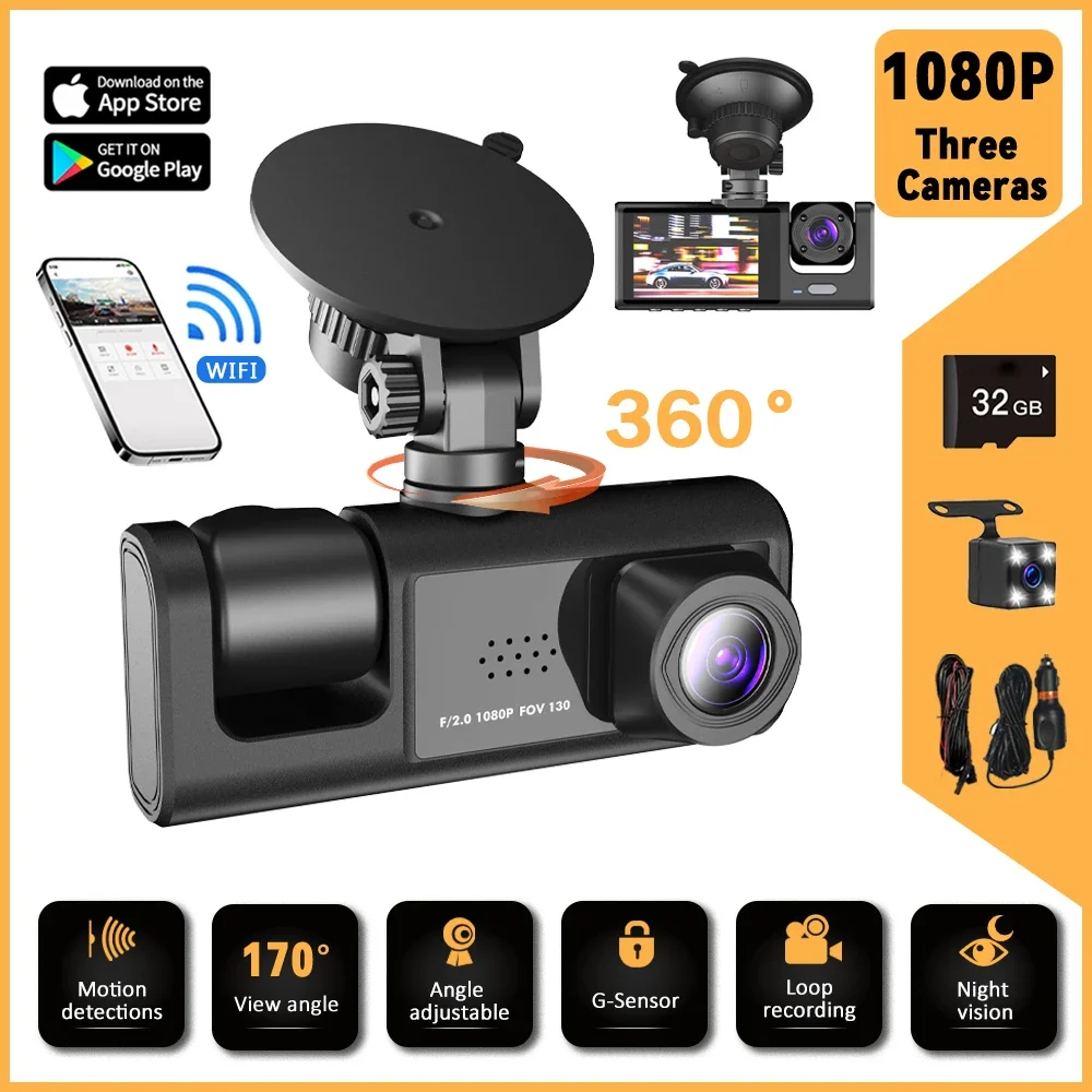 Câmera Veicular 3 Canais 360 ° Gravador de Vídeo Noturno para Carro com Visão em Todos os Lados, Wi-Fi Integrado, HD 1080P, Três Lentes, Monitoramento 24 Horas, Câmera para Carro