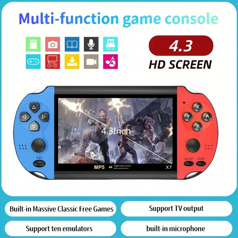 Console de Jogo Portátil Retro X7 com Tela HD de 4.3 Polegadas, Joysticks Duplos, Dispositivo de Jogos PSP MP5 com 8G Integrado e 10000 Jogos Clássicos
