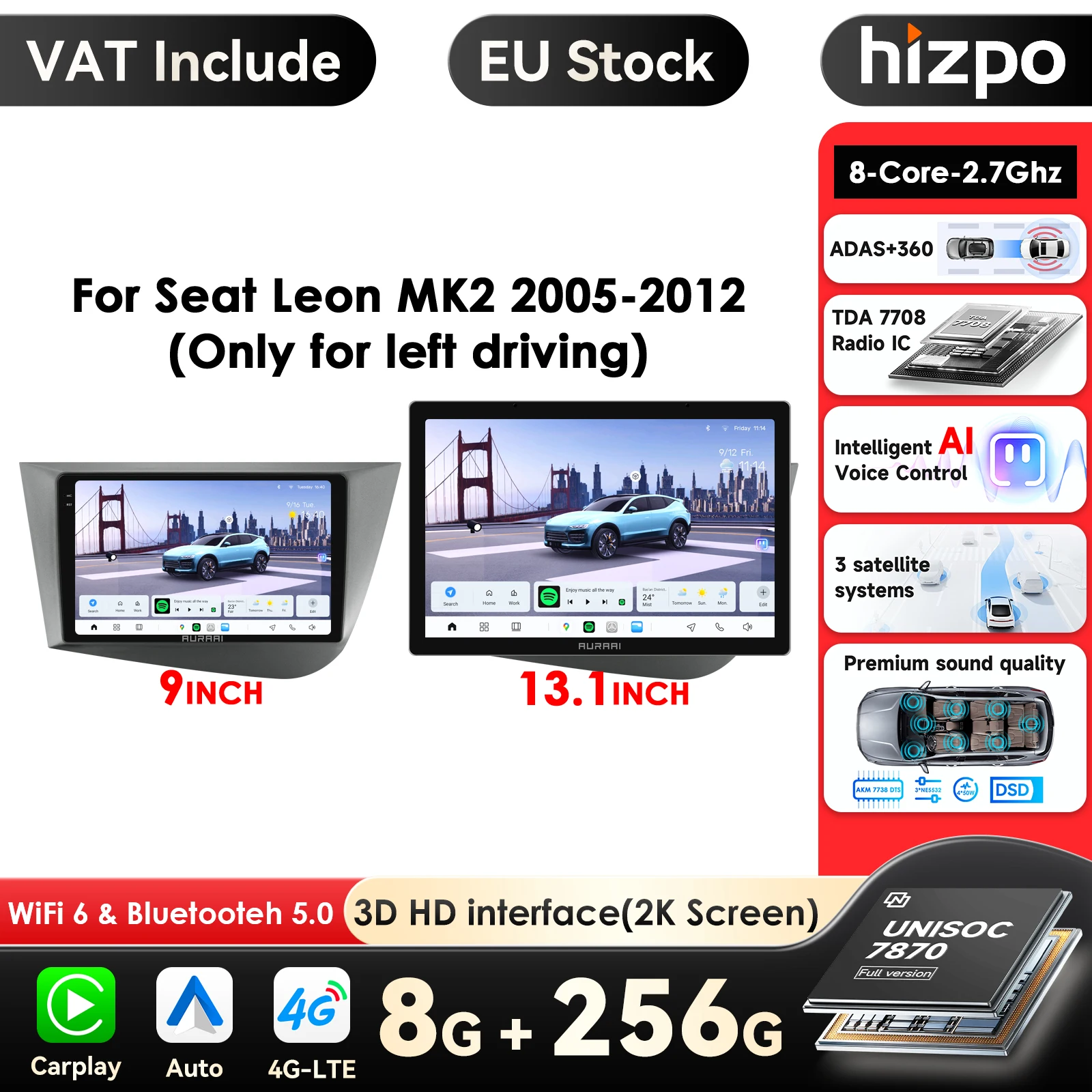 Rádio de Carro Hizpo de 13,1 polegadas para Seat Leon 2 mk2 5 2005 - 2012, Player Multimídia Carplay Android Auto, Sistema Inteligente de Navegação GPS, Tela QLED 1920*1200 2K 3D, Monitor de Vídeo e Áudio 360 ° Câmera ADAS TDA7851 Amplificador