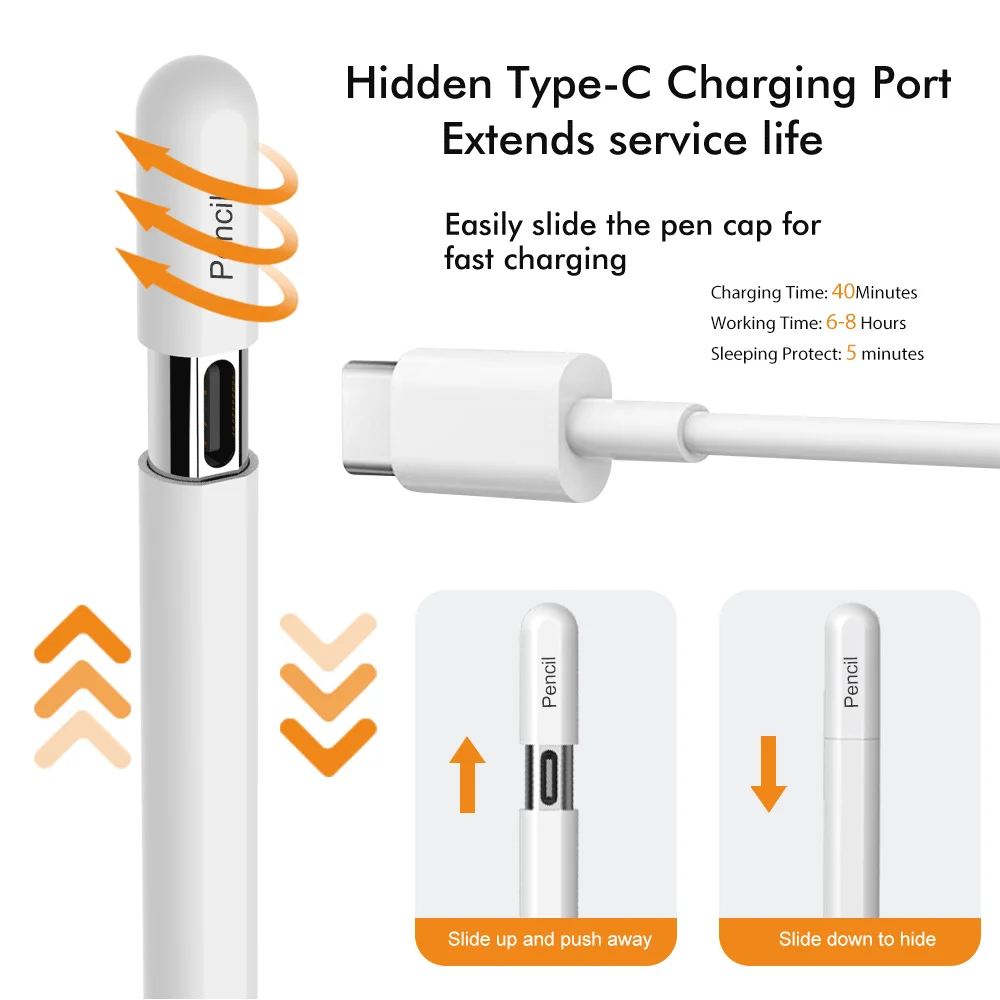 Caneta Stylus Touch Pen com Ponta Pro para Apple Pencil, para iPad 11 13 M2 M3 M4 Mini 7ª 9ª 8ª Geração, Tablet, com Carregamento Tipo C, Lápis para Tela