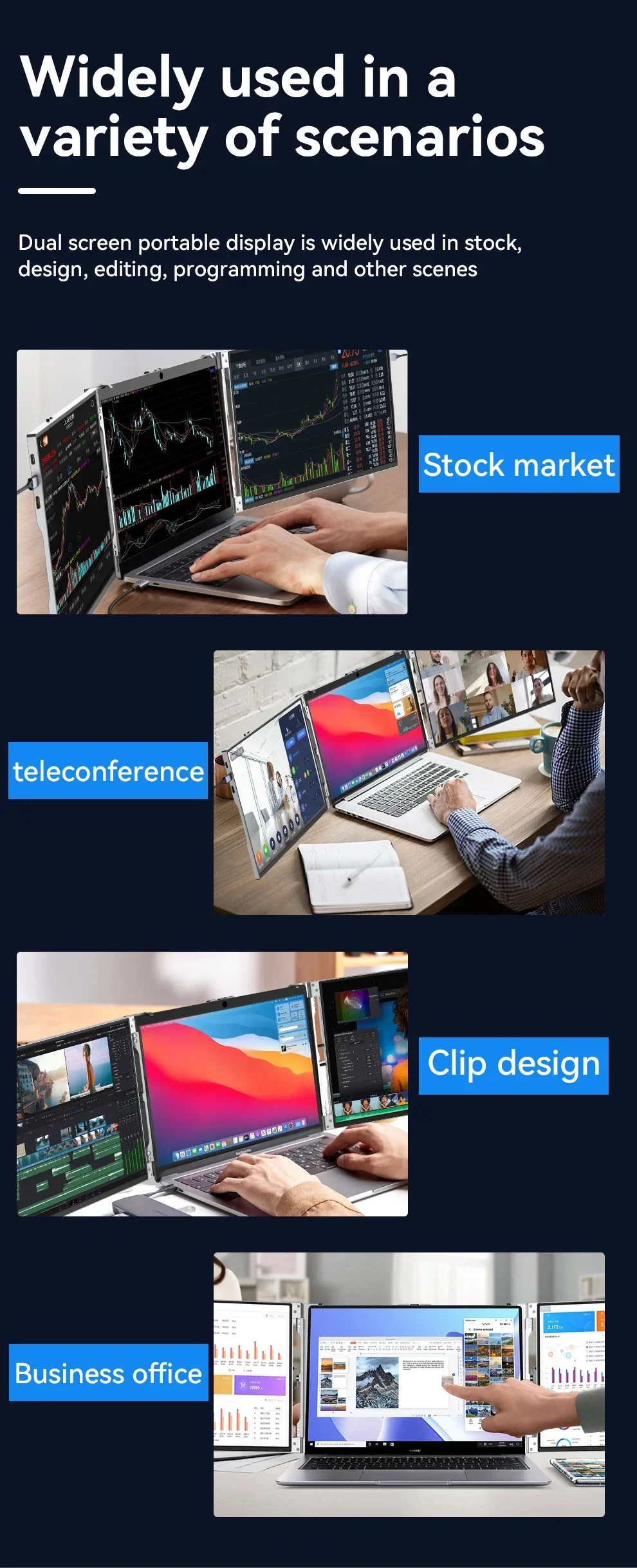 Extensor de Tela Dupla para Laptop de 14, 15.6 e 16 Polegadas 1080P, Monitor Portátil para Três Telas