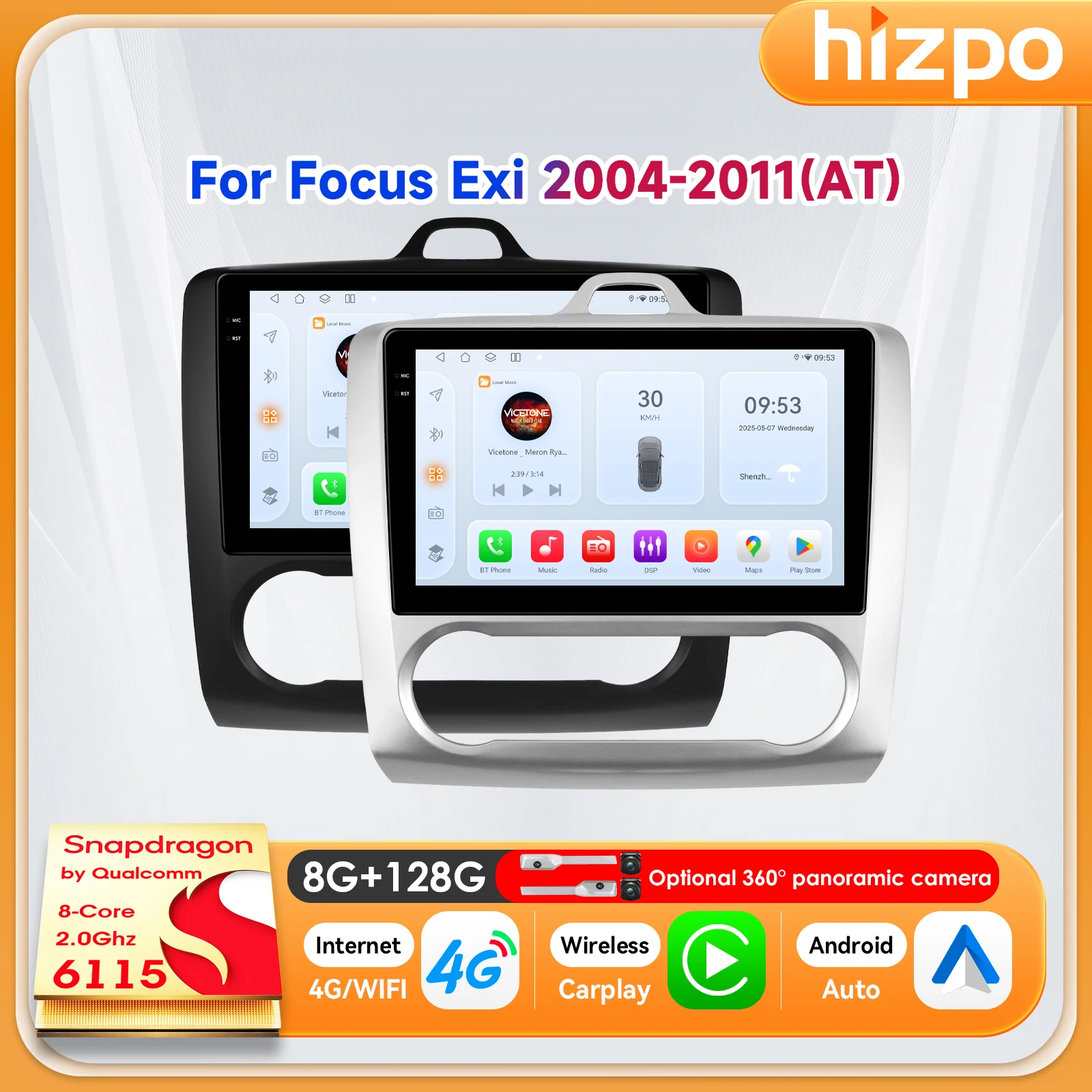 Hizpo 9\" Android 14 para Ford Focus 2 3 Mk2 2004 2005 2006 2007 - 2011 Rádio de Carro Navegação Multimídia Player WIFI+4G GPS Carplay