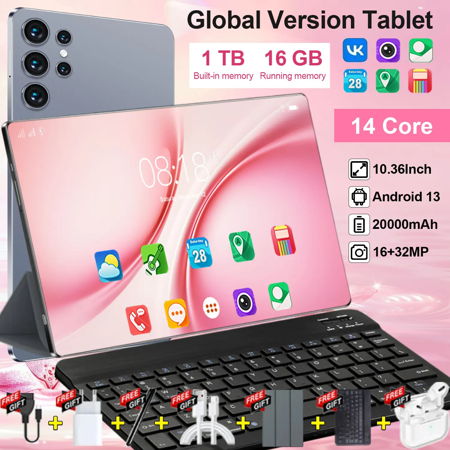 Novo Tablet 5G 2026 com 16GB+1TB, Tela de 10.36 polegadas, 14 núcleos, Bateria de 20000mAh, Android 13.0, Bluetooth, WIFI, GPS, Tablet HD para Escritório com Teclado