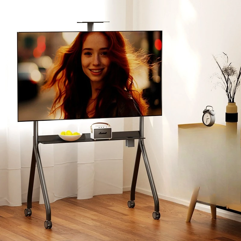 Suporte de TV de piso móvel Suporte de TV universal de madeira com rodas para LED LCD de 40 a 75 polegadas com altura ajustável e gerenciamento de cabos