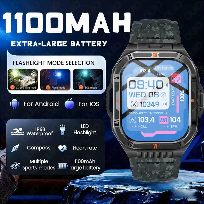 2026 novo 1100mah bateria grande relógio inteligente 2.01 Polegada lanterna bússola ip68 à prova dip68 água bluetooth chamada 100 + esportes relógio inteligente masculino