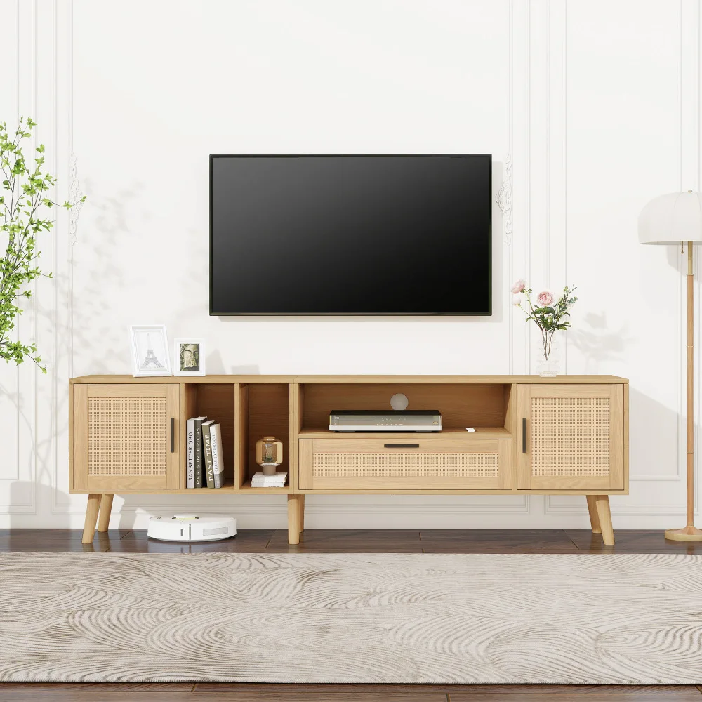 Suporte de TV de 69" com tomada de energia para TVs de até 80", centro de entretenimento com armazenamento e gaveta, console de TV com prateleiras ajustáveis