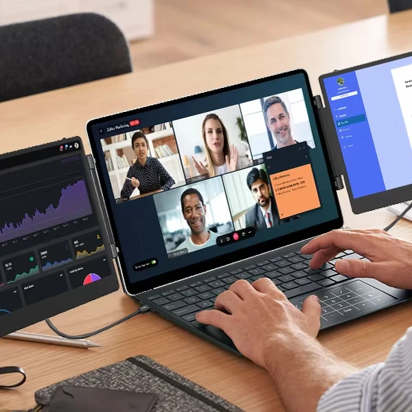Extensor de laptop dobrável de tela tripla de 14 polegadas com monitor portátil e conexão tipo C para codificação, negociação e multitarea
