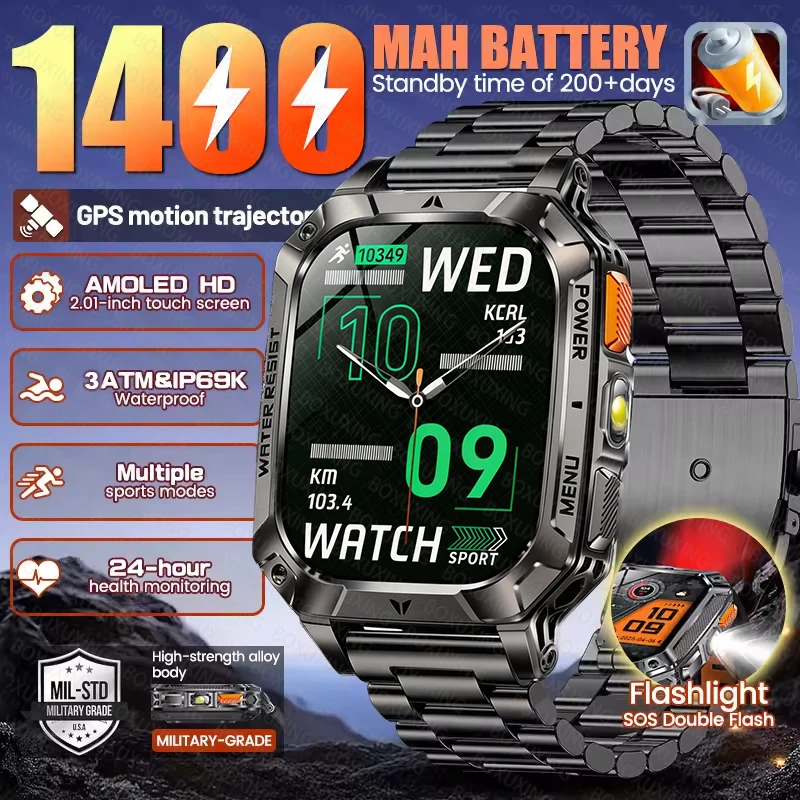 Relógio Inteligente Masculino com Bateria Super Grande de 1400mAh Integrada, GPS para Atividades ao Ar Livre, Tela AMOLED de 2.01", Resistente à Água 3ATM, Chamada HD, Smartwatch 2026 Novo