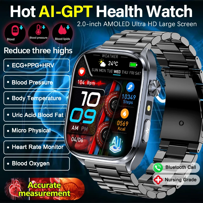 Relógio de Saúde AI de Novo Tipo 2.0" AMOLED com ECG, Pressão Arterial, Ácido Úrico, Lipídios no Sangue, Temperatura Corporal, Chamada Bluetooth, Smartwatch para Android e iOS