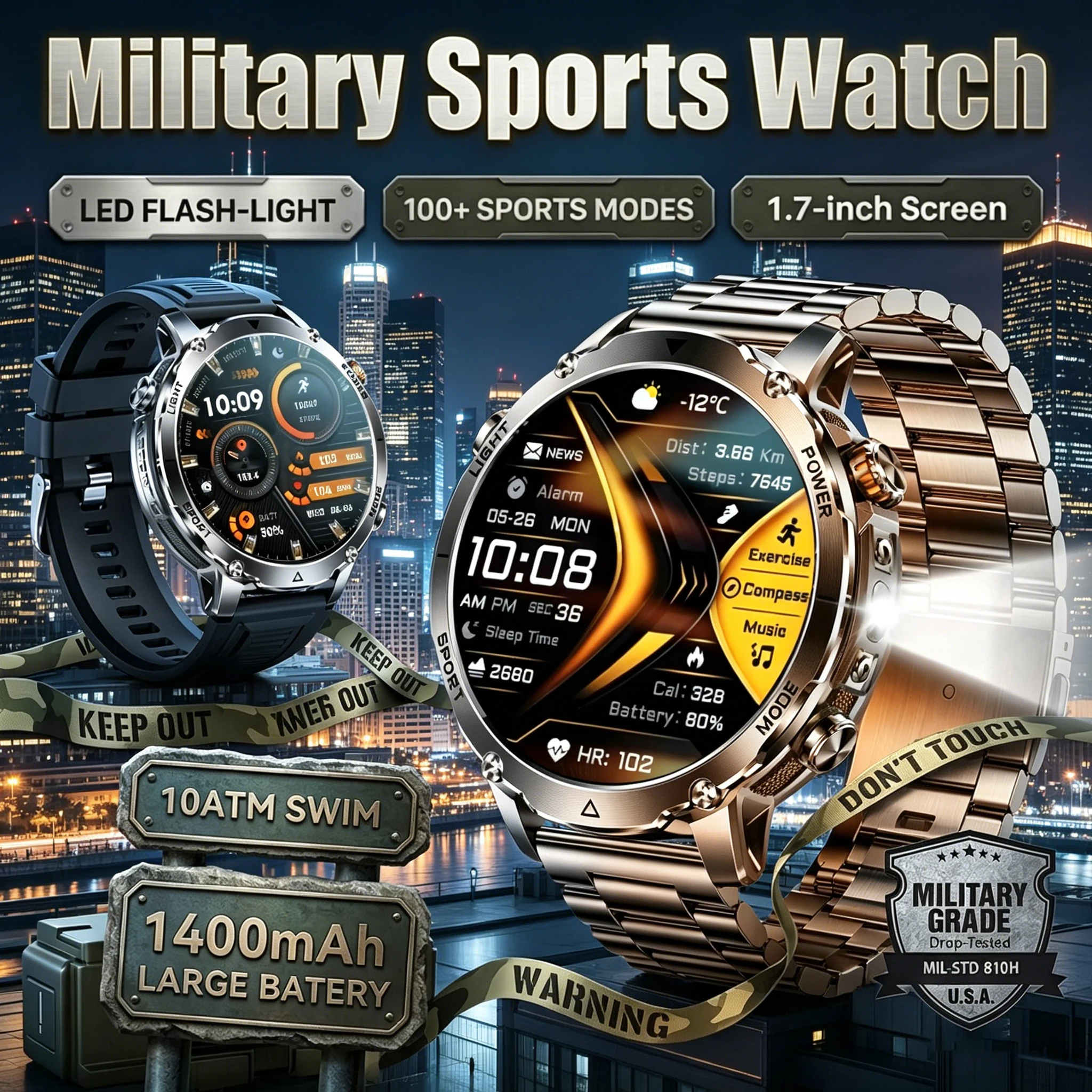 Novo Relógio Inteligente Militar 2026 para Homens com Bateria de 1400 mAh, para Esportes ao Ar Livre, Monitor de Frequência Cardíaca, IP68 à Prova d'Água, Smartwatch para iOS e Android
