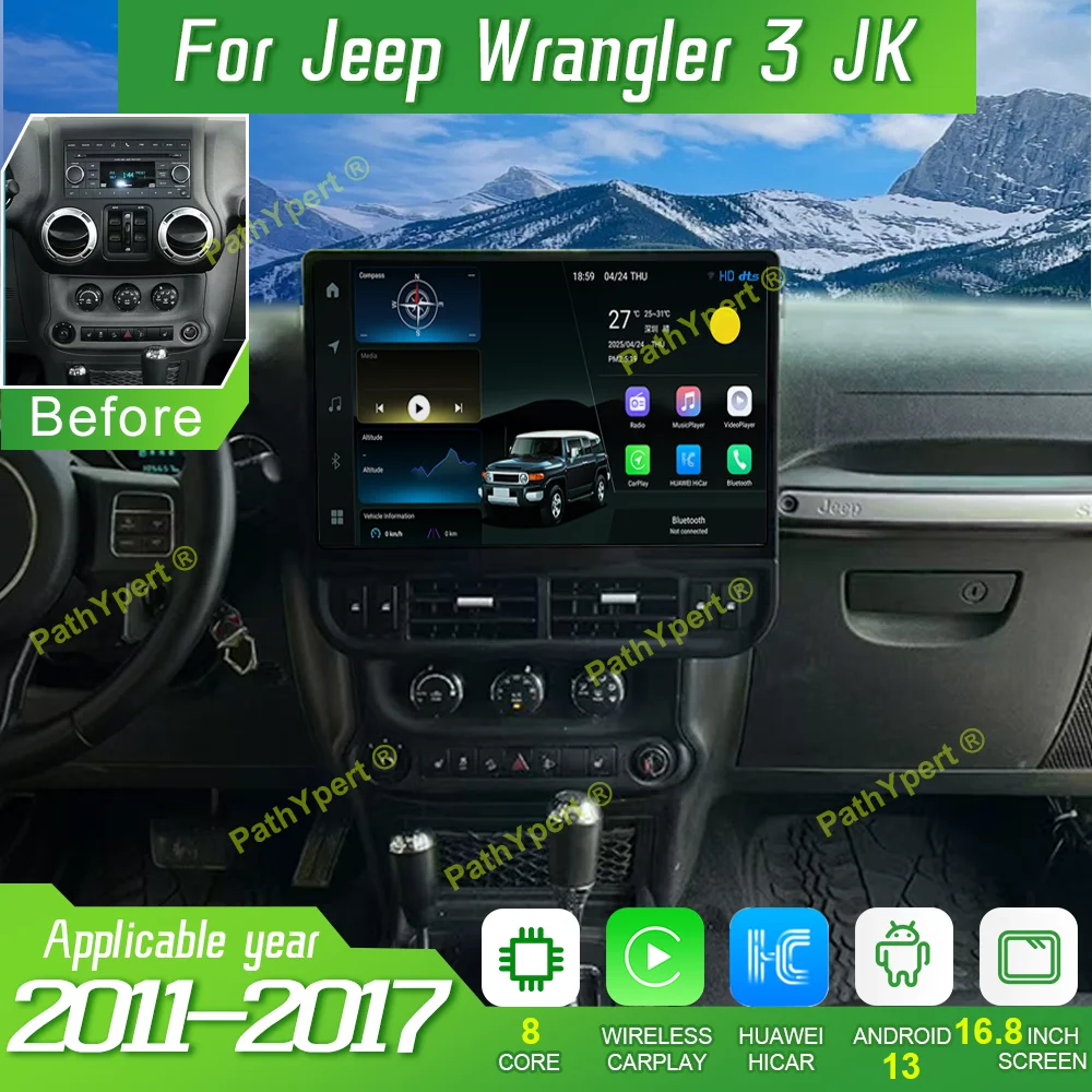 Ecrã gigante 2K de 16,8" com Android 13 para Jeep Wrangler 3 JK 2011-2017, CarPlay sem fios, Huawei HICar, Qualcomm 6125, rádio automóvel, Bluetooth, 4G e DSP.