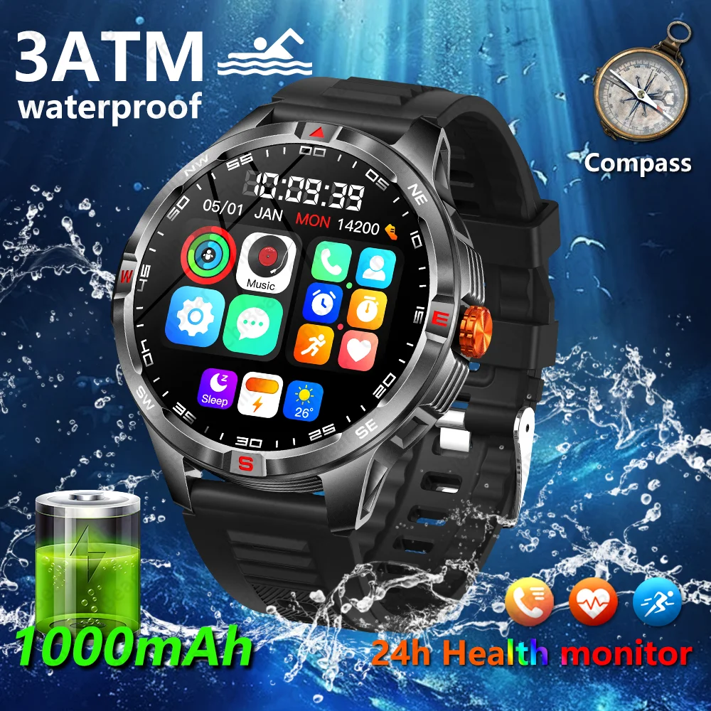 2026 relógio inteligente masculino 1000mah bateria de longa duração bússola bluetooth chamada 3atm à prova dwaterproof água fitness esporte smartwatch para android ios