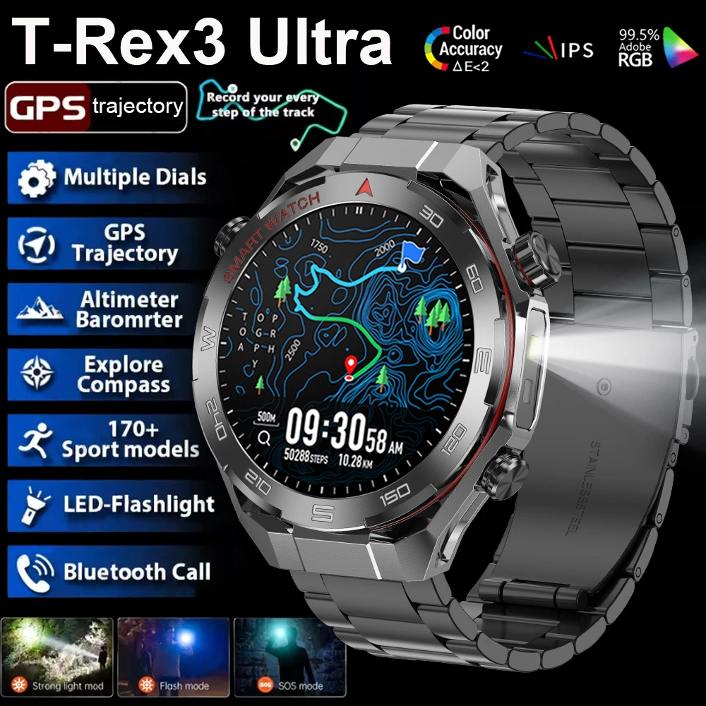 Novo Relógio Inteligente Militar T-Rex 3 Ultra 2026 para Esportes ao Ar Livre com GPS, Lanterna, Monitor de Frequência Cardíaca e Rastreador de Atividades para Homens