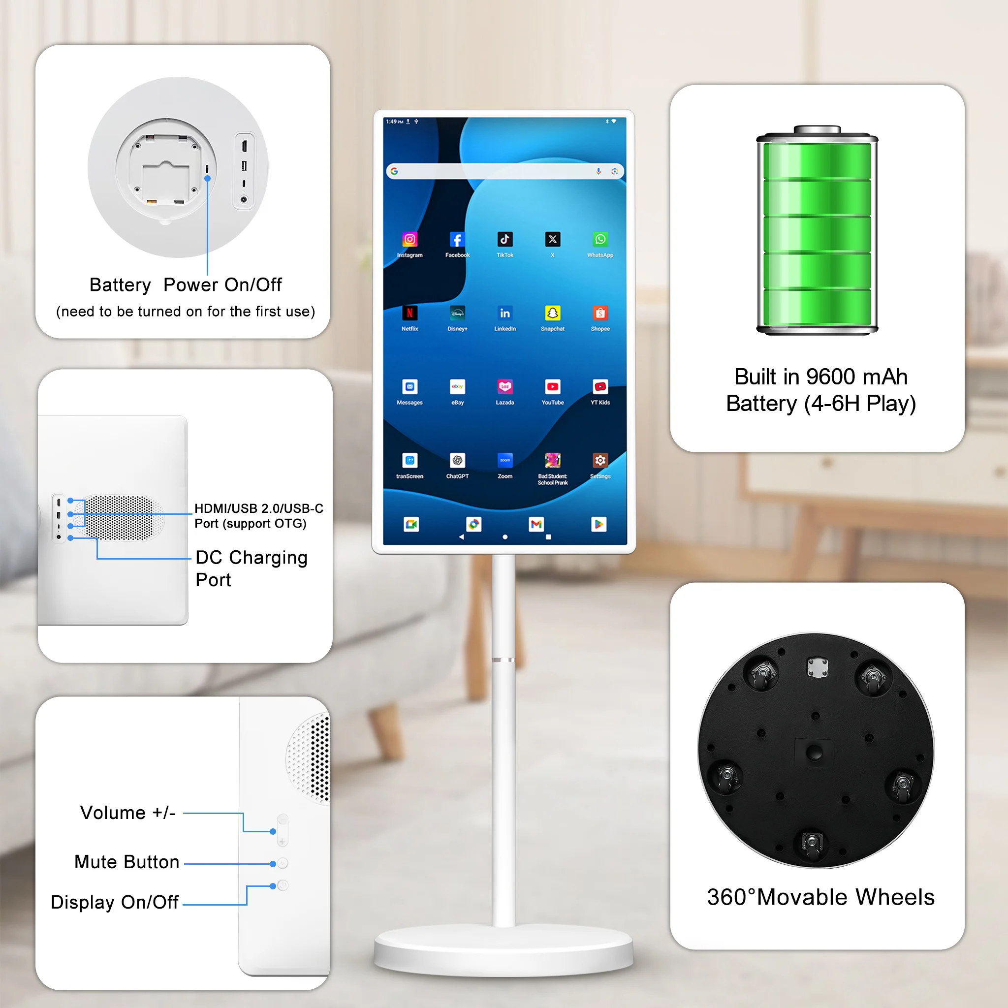 Smart TV com tela sensível ao toque rotativa de 32 polegadas com bateria Tela de publicidade interativa portátil para casa
